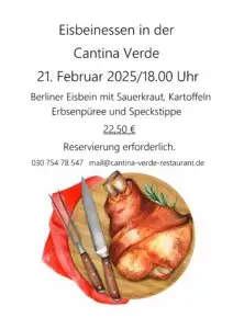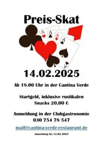 Heute wird Skat gespielt in der Cantina Verde. ab 18:00 Uhr Startgeld inkl. rustikaler Snacks: 20,00 € Anmeldung in der Cantina Verde über die ausliegende Liste (oder Tel. 030 754 78 547 oder mail@cantina-verde-restaurant.de) Anmeldung bis 12.02.2025
