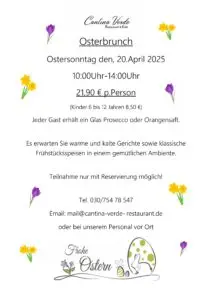 ![]() Osterbrunch heute in der Cantina Verde! Details: Ostersonntag, 20. April 2025 10:00 - 14:00 Uhr pro Person 21,90€ inkl. einem Glas Prosecco oder Orangensaft (Kinder von 6 - 12 Jahre 8,50€) Warme und kalte Gerichte sowie klassischen Frühstücksspeisen in unserer Cantina Verde. Reservierung erforderlich! Tel. 030/754 78 547 oder E-Mail: mail@cantina-verde- restaurant.de oder persönlich in […] |