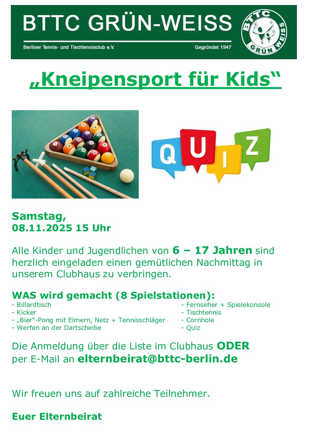 Hallo liebe Kids und Jugendliche des BTTC, ihr seid herzlich zu einem gemütlichen Kneipensport-Abend im Clubhaus des BTTC eingeladen (u. a. Kicker, Tischtennis und Billard). Organisiert wird die Veranstaltung vom […]
